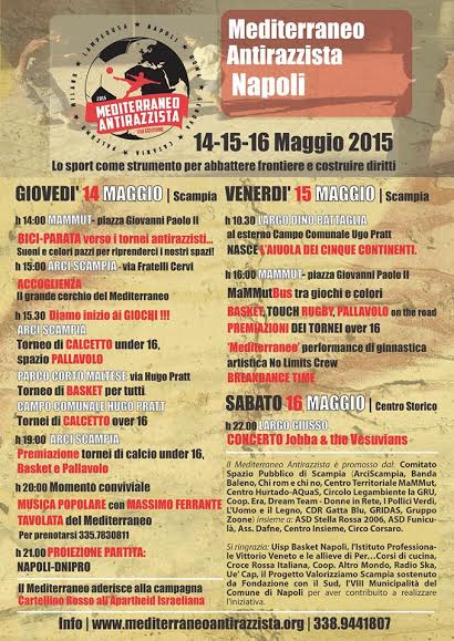 Il Mediterraneo Antirazzista Napoli si aprirà giovedì 14 maggio alle 14:00 con la consueta parata di artisti di strada che accompagnerà i partecipanti da Piazza Giovanni Paolo II (punto di concentramento), ai campi dove si svolgeranno i tornei antirazzisti, prima tutti insieme all’Arci Scampia per una calda accoglienza, dove si fermeranno i giocatori di pallavolo e calcio delle categorie under 16, mentre gli iscritti al torneo di calcio over 16 proseguiranno verso lo Stadio Comunale di via Hugo Pratt. Gli appassionati di basket invece proseguiranno per i campi di Parco Corto Maltese. La giornata si concluderà con un momento conviviale all’ArciScampia sulle note del grande cantore di musica popolare Massimo Ferrante. La serata si chiuderà con una grande tavolata e la proiezione della partita Napoli – Dnipro.